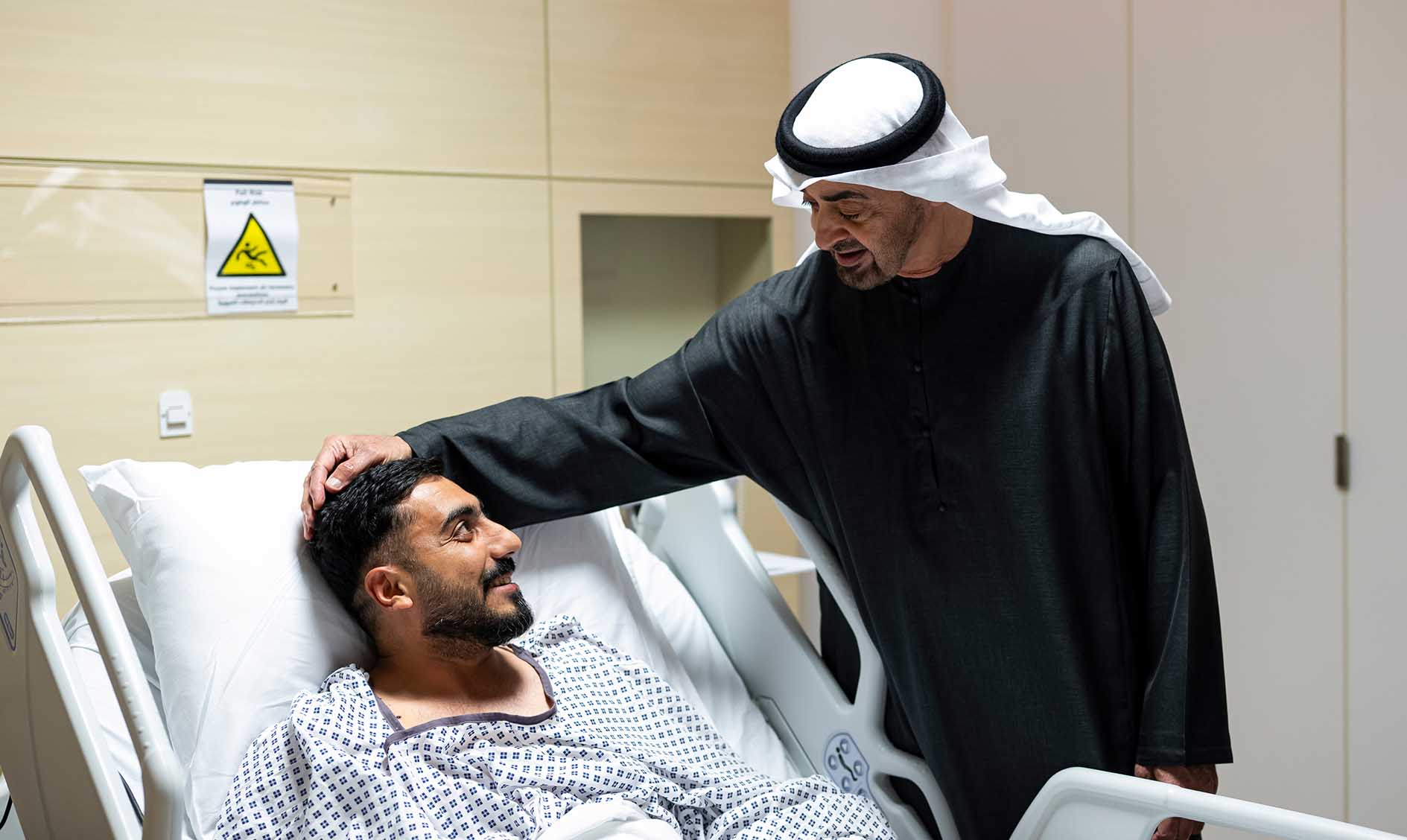 সংযুক্ত আরব আমিরাতের রাষ্ট্রপতি মহামান্য শেখ মোহাম্মদ বিন জায়েদ আল নাহিয়ান আবুধাবির শেখ শাখবাউট মেডিকেল সিটিতে চিকিৎসাধীন একজন আহত রোগীকে দেখতে গেছেন।